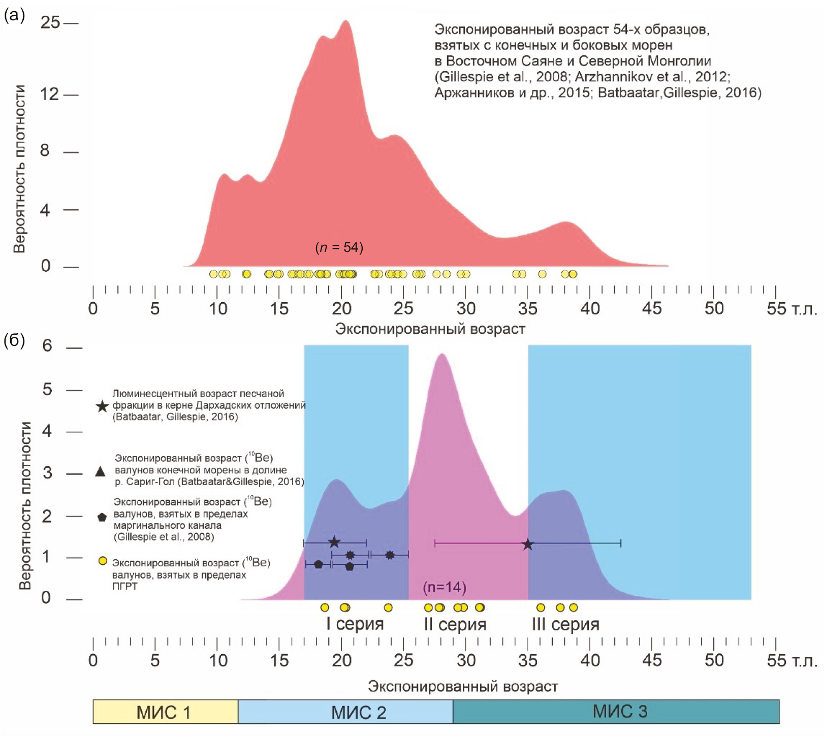 В результате датирования валунов, расположенных в пределах ПГРТ, получены три серии дат. Для анализа и их корреляции с основными событиями позднего плейстоцена нами приведена схема распределения экспонированных образцов (¹⁰Be), датирующих основные этапы выдвижения ледников в горных массивах Восточного Саяна и Северной Монголии (Gillespie et al., 2008; Arzhannikov et al., 2012; Arzhannikov et al., 2015; Batbaatar, Gillespie, 2016a, 2016b) (рис. 21, (а)), экспонированный возраст валунов с поверхности морены в долине р. Их-Сариг-Гол и маргинального канала (Batbaatar, Gillespie, 2016b; Gillespie et al., 2008), ГРТ, стадий морской изотопной шкалы и этапов существования Дархадского палеоозера по данным Gillespie et al. (2008) (рис. 21, (б)).