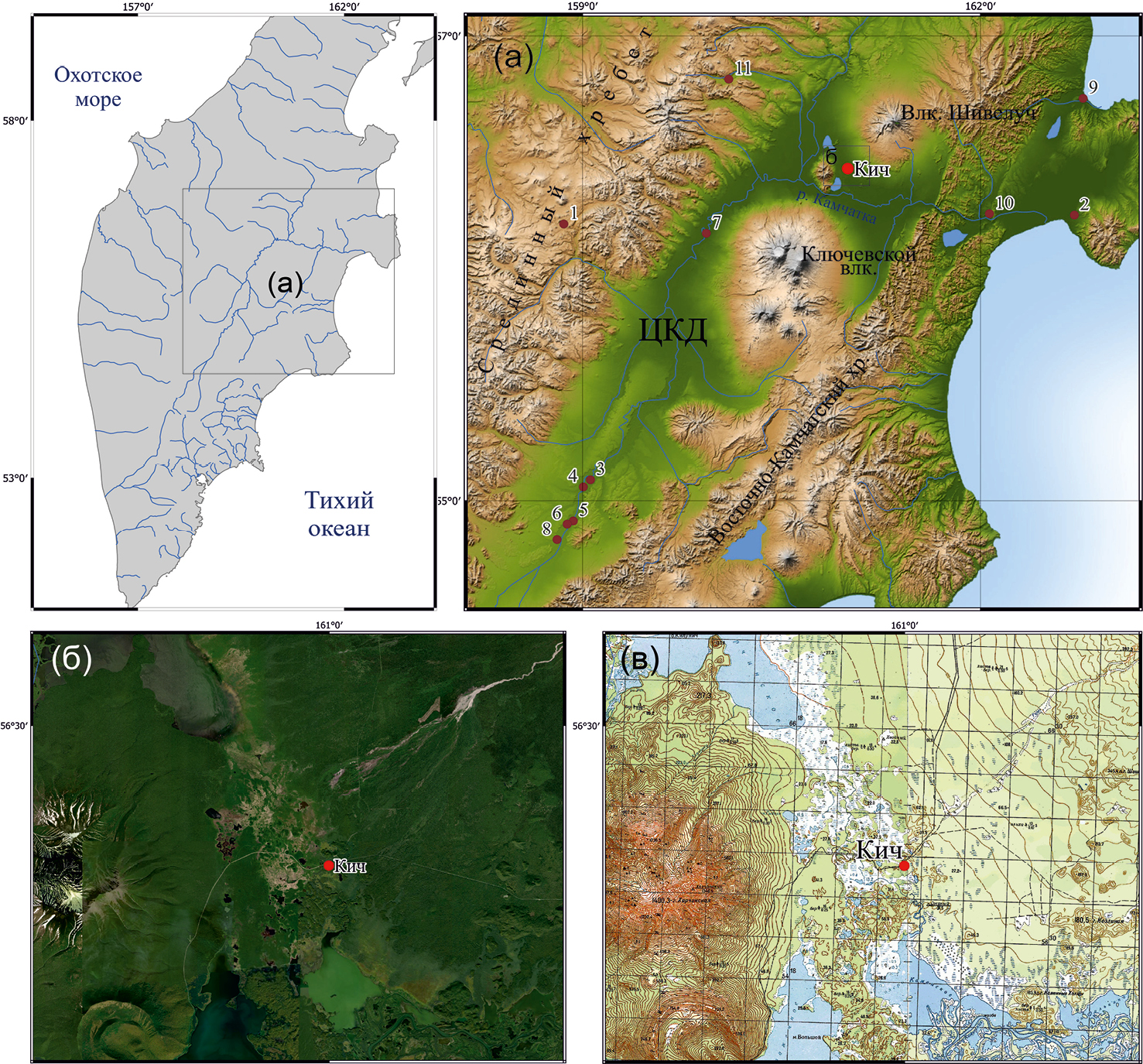 Fig. 1. The position of the Kich core and the previously studied by other palynologists Holocene sections (1-11) of the central and northern parts of the Peninsula (а) and the position of the Kich section on the satellite image (б) and topographic map (в). 1 – Olive-backed Lake (Self et al., 2015); 2 – Krutoberegovo (Pendea et al., 2017); 3 – Nedostupny Yar; 4 – Bol’shoi Yar; 5 – Krutoi Yar; 6 – Polovinka Yar (sites 3–6: Braitseva et al., 1968); 7 – Ushki (Lozhkin, Slobodin, 2012); 8 – Kirganinskaya Tundra (Khotinsky, 1977); 9 – Stolbovaya (Dirksen et al., 2013); 10 – Cherny Yar (Andreev, Pevzner, 2001); 11 – Two-Yurts Lake (Hoff et al., 2015).