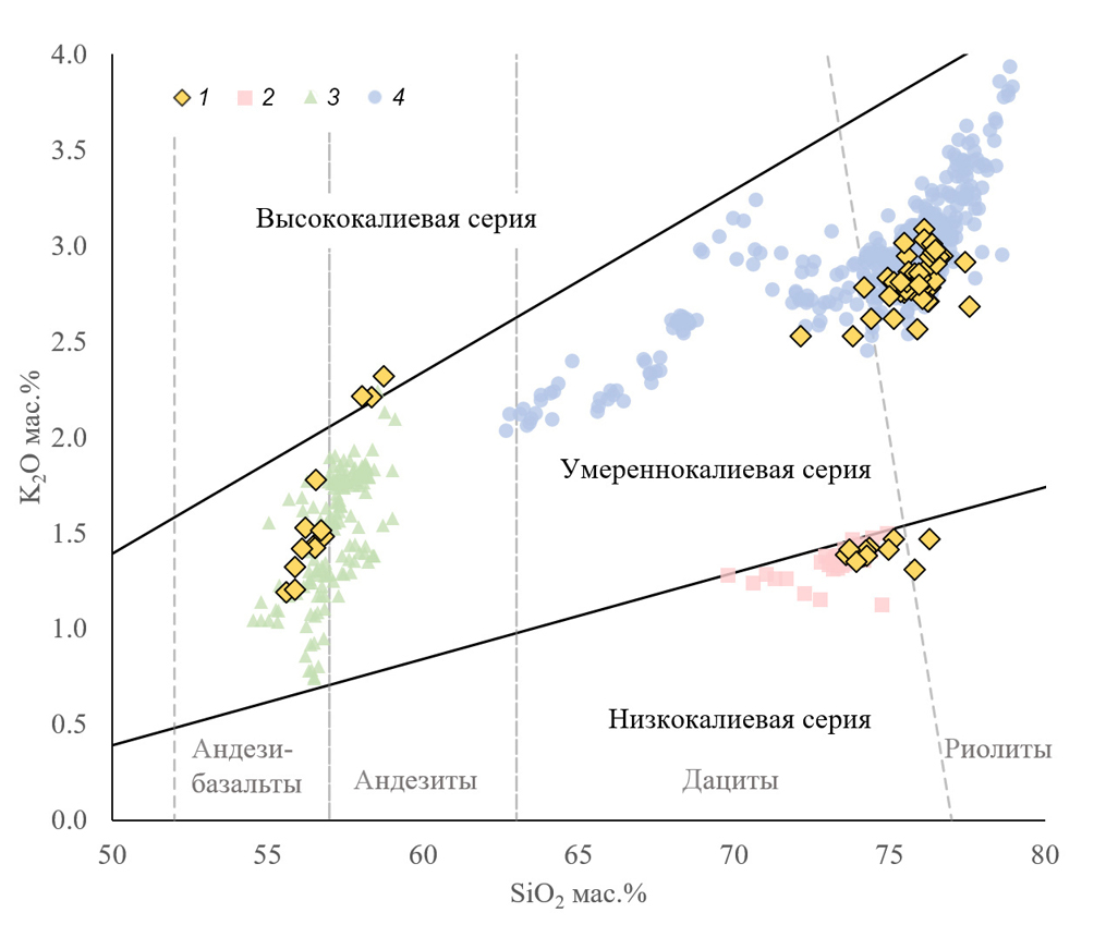 Составы стекол из проксимальной пирокластики моложе 3000 лет по базе данных TephraKam (Portnyagin et al., 2020). Границы полей низко-, умеренно- и высококалиевых составов показаны согласно работе (Gill, 1981). Границы полей андезибазальтов, андезитов, дацитов и риолитов показаны согласно диаграмме TAS (Le Maitre et al., 2005).