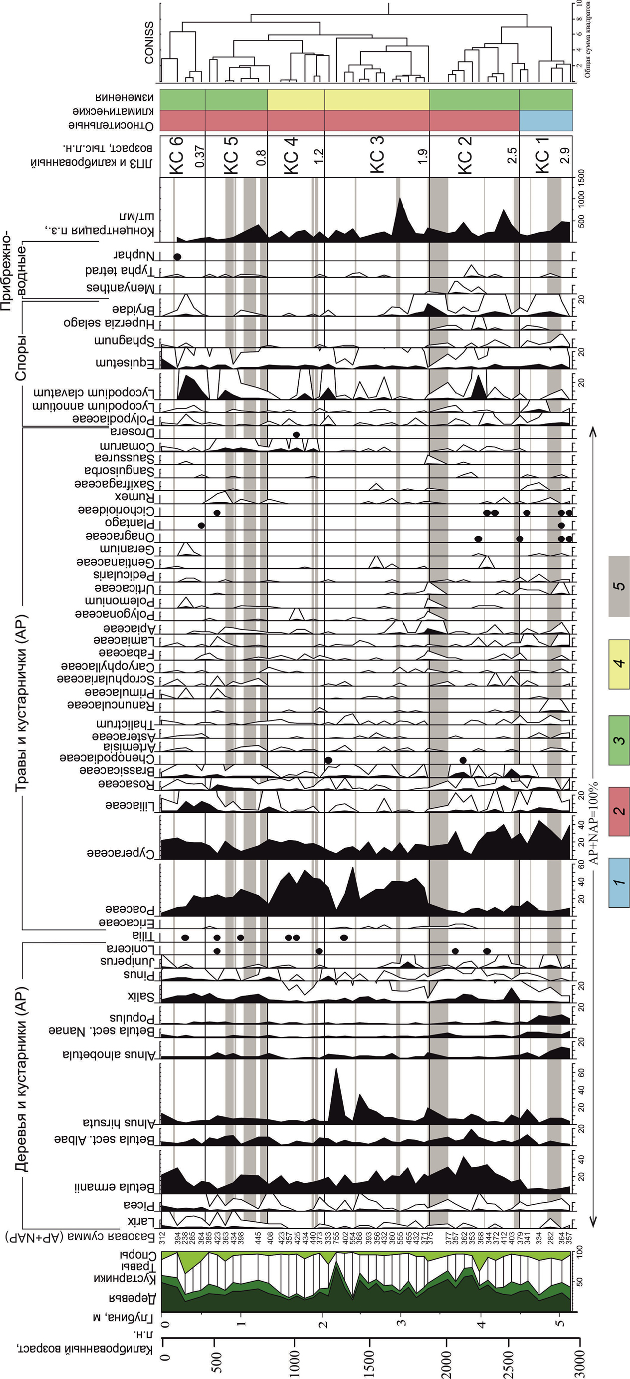 Методом СП анализа было исследовано 47 образцов. При расчете процентных соотношений пыльцевых таксонов за базовую сумму принималась сумма пыльцы наземных растений (AP – Arboreal pollen, пыльца деревьев и кустарников; NAP – Non-arboreal pollen, пыльца трав и кустарничков). Доля спор и пыльцы водных растений высчитывалась относительно базовой суммы, к которой добавлялось количество пыльцы или спор рассматриваемой группы. Статистическая обработка результатов СП анализа и построение диаграммы проведены с использованием программы Tilia v.3.0.1 (Grimm, 1990), оформление диаграммы проводилось в программе Corel Draw. Определение степени статистической близости пыльцевых спектров для уточнения положения границ локальных пыльцевых зон (ЛПЗ) проведено при помощи кластерного анализа в программе CONISS (Grimm, 1987).