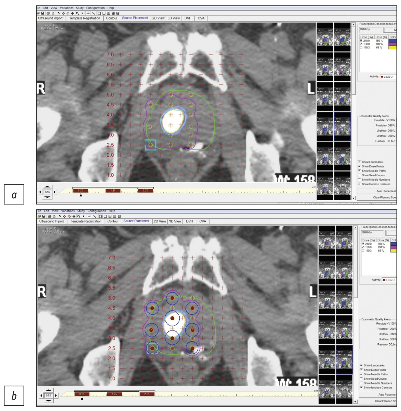 Brachytherapy with implantation of micro sources based on isotope 125I is a preferred treatment for localized prostate cancer without signs of germination of the gland capsule and in the absence of signs of metastases (stage cT1-T23aN0M0). Structural imaging methods (ultrasound, computed tomography, and magnetic resonance imaging) do not have high specificity in the differential diagnosis of prostate cancer. Hybrid technologies of radiation imaging (single-photon emission computed tomography/computed tomography, positron emission tomography/computed tomography, and positron emission tomography/magnetic resonance imaging) combine the advantages of high sensitivity of cross-sectional structural imaging methods (computed tomography and magnetic resonance imaging) and high specificity of molecular imaging methods (single-photon emission computed tomography and positron emission tomography) with tumorotropic radiopharmaceuticals. In this original clinical study, based on seven observations of localized prostate cancer (Gleason 6–7), it was shown that the precision of low-dose brachytherapy using 125I micro sources of localized prostate carcinomas, along with targeted biopsy, can be increased using hybrid methods of PSMA-receptor molecular imaging (single-photon emission computed tomography/ computed tomography, positron emission tomography/ computed tomography). The single-photon emission computed tomography/ computed tomography method is more accessible than positron emission tomography/ computed tomography. Moreover, when coupled with cold kits (HYNIC-PSMA), it allows research within any radioisotope diagnostics laboratory equipped with single-photon emission computed tomography/ computed tomography. The innovative technology of PSMA-navigation biopsy and brachytherapy, under the control of hybrid molecular imaging, can be used in primary and recurrent cases of localized prostate cancer, increases the accuracy and reduces the traumatic nature of procedures, and increases the medical and economic efficiency of low-dose brachytherapy with 125I micro sources. Further research is needed to improve the technology and evaluate its long-term results.
