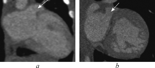 Рис. 2. В реформации левых камер сердца ушко морфологически левого предсердия при транспозиции магистральных сосудов (а, стрелка), при корригированной транспозиции магистральных сосудов (b, стрелка)