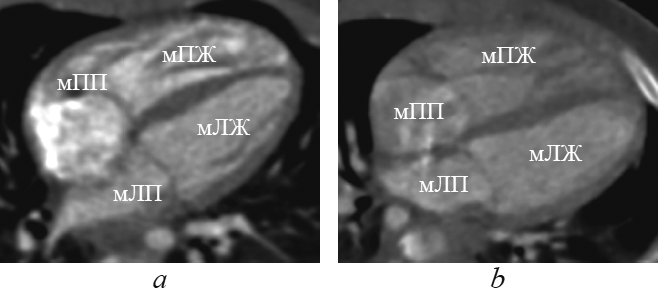 Анатомические признаки ушка, характерного для морфологически правого предсердия (треугольная форма с тупой вершиной, широкое соединение с предсердной полостью, слабо выраженная дольчатость [1, 2, 4, 16]), определяют в реформации по длинной оси приносящего тракта правого желудочка (рис. 1). В этой реформации видно, что при транспозиции морфологически правое предсердие соединяется с морфологически правым желудочком (см. рис. 1, а), а при корригированной транспозиции морфологически правое предсердие — с морфологически левым желудочком (см. рис. 1, b).