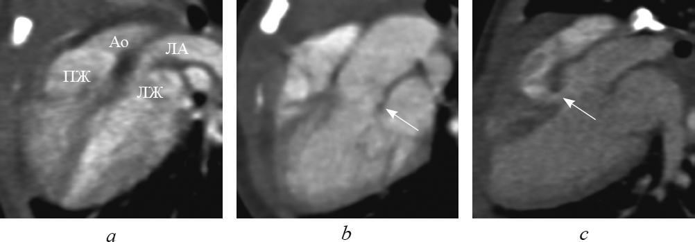 Fig. 7. Long-axis of left ventricle reformation in great arteries transposition: outflow tracts and great arteries are parallel (а); semi-lunar fibrous prolongation (b, arrow) and interventricular sept defect (c, arrow) are determined. Ао – aorta; ЛА – pulmonary artery; ЛЖ – left ventricle; ПЖ – right ventricle