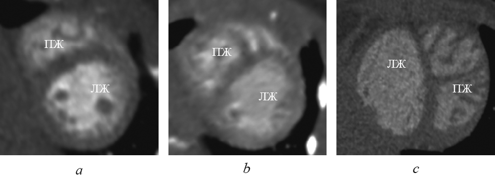 Fig. 9. Short-axis of left ventricle reformation: а – normal; b – great arteries transposition; c – corrected great arteries transposition; ЛЖ — left ventricle; ПЖ — right ventricle
