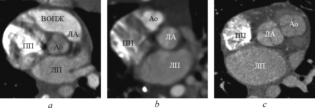 Fig. 10. Short-axis reformation at the level of great arteries: а – normal; b – great arteries transposition; c – corrected great arteries transposition. Ао – aorta; ВОПЖ – the output portion of the right ventricle; ЛА – pulmonary artery; ЛП – left atrium; ПП — right atrium