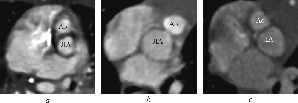 Fig. 11. The spatial relationship of the aorta and pulmonary artery in short-axis reformation at the level of great arteries: а – opposite; b – at the front and at the left; c – at the front and at the right. Ао – aorta; ЛА – pulmonary artery