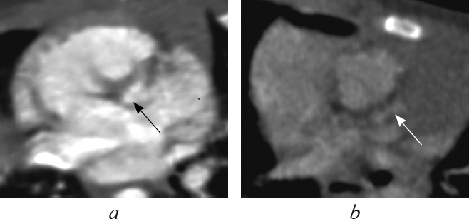 Fig. 2. Left heart chambers reformation. The eyelet of the morphologically left ventricle in great arteries transposition (a, arrow) and in corrected great arteries transposition (b, arrow)
