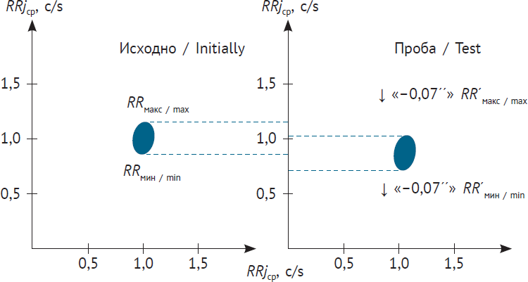 Наглядный пример вегетативного обеспечения сердечной деятельности с дезадаптацией за счет низкой реактивности обоих отделов ВНС представлен на рис. 4. Из рисунка видно, что исходно по КРГ определяется ваготонический тип вегетативной регуляции (RRср = 1,1 с). При дыхательной пробе отмечается недостаточная реакция парасимпатического отдела ВНС, поскольку исходно значение интервала RRмакс = 1,16 с, при дыхательной пробе интервал RR’макс = 1,2 с, то есть произошло увеличение RR’макс только на 0,04 с (при норме 0,05–0,10 с). Это отражает недостаточную реактивность парасимпатического отдела ВНС на функциональную пробу. Исходно значение интервала RRмин = 0,77 с, а при дыхательной пробе интервал RR’мин = 0,73 с, то есть он уменьшился на 0,04 с (при норме 0,05–0,10 с). Эти изменения свидетельствуют о вегетативной дисфункции с низкой реактивностью симпатического отдела ВНС на функциональную пробу.