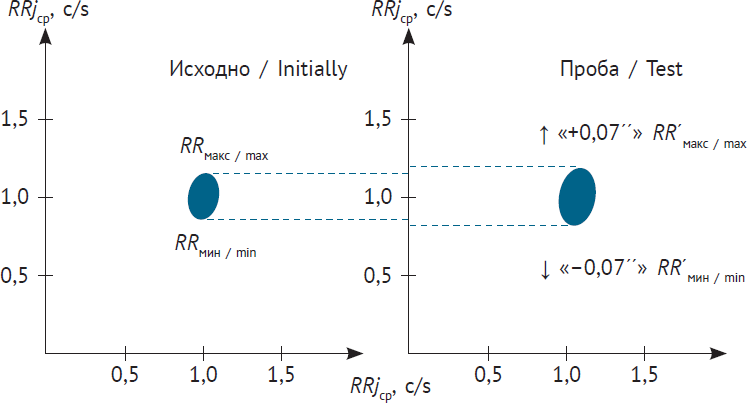 Наглядная иллюстрация вегетативного обеспечения сердечной деятельности с дезадаптацией за счет высокой реактивности обоих отделов ВНС представлена на рис. 6. Очевидно, что исходно по КРГ определяется ваготонический тип вегетативной регуляции (RRср = 1,1 с). При дыхательной пробе отмечается гиперреактивность парасимпатического отдела ВНС, поскольку исходно продолжительность интервала RRмакс = 1,16 с, при дыхательной пробе значение интервала RR’макс = 1,28 с, то есть произошло увеличение RR’макс только на 0,12 с (при норме 0,05–0,10 с). Это отражает избыточно высокую реактивность парасимпатического отдела ВНС на функциональную пробу. Исходно значение интервала RRмин = 0,77 с, а при дыхательной пробе продолжительность интервала RR’мин = 0,64 с, то есть она уменьшилась на 0,13 с (при норме 0,05–0,10 с). Подобные изменения свидетельствуют о вегетативной дисфункции с повышенной реактивностью обоих отделов ВНС на функциональную пробу.