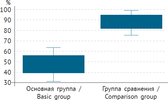 Примечания: 1 отличие первой от второй группы сравнения статистически значимо (р < 0,009); 2 отличие первой от третьей группы сравнения статистически значимо (р < 0,001); 3 отличие второй от третьей группы сравнения статистически значимо (р = 0,002). Notes: 1 the difference between the first and the second comparison groups is statistically significant (р < 0.009); 2 the difference between the first and the third groups of comparison is statistically significant (р < 0.001); 3 the difference between the second and third groups of comparison is statistically significant (р = 0.002) | |