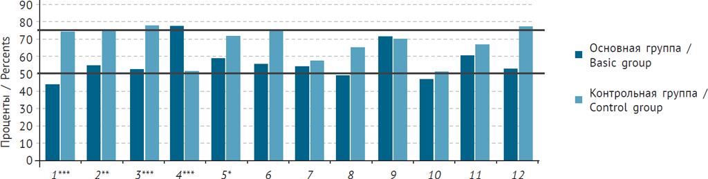 Рис. 1. Результаты исследования самоотношения: 1 — ожидаемое самоотношение; 2 — самоуверенность; 3 — самопринятие; 4 — самообвинение; 5 — самопонимание; 6 — глобальное самоотношение; 7 — самоуважение; 8 — аутосимпатия; 9 — самоинтерес 1; 10 — отношение других; 11 — саморуководство; 12 — самоинтерес 2; показатель значимости различий между группами: * (р < 0,05), ** (р < 0,01), *** (р < 0,001)