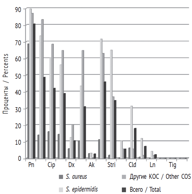 Рис. 2. Устойчивость стафилококков к отдельным антимикробным препаратам. Pn — пенициллин, Cip — ципрофлоксацин, Dx — доксициклин, Ak — амикацин, Stri — сульфаметоксазол/триметоприм, Cld — клиндамицин, Ln — линезолид, Tig — тигециклин. КОС — коагулазоотрицательные стафилококки