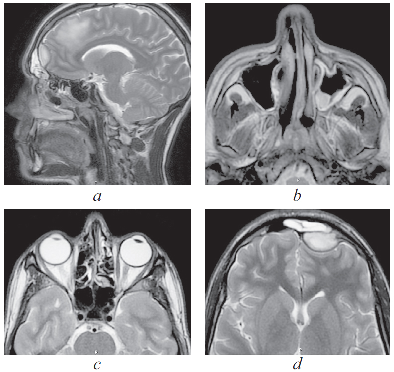 Рис. 2. Магнитно-резонансная томография головного мозга от 16.06.2021: а — сагиттальная проекция в режиме Т2. Прослеживаются воспалительные изменения оболочек в левой лобной области. Картина соответствует субдуральной эмпиеме; b — аксиальная проекция в режиме Т2. Снижение пневматизации левой верхнечелюстной пазухи, пристеночный отек слизистой; c — аксиальная проекция в режиме Т2. Снижение пневматизации клеток решетчатого лабиринта; d — аксиальная проекция в режиме Т2. Воспалительные изменения оболочек в левой лобной области, субдуральная эмпиема