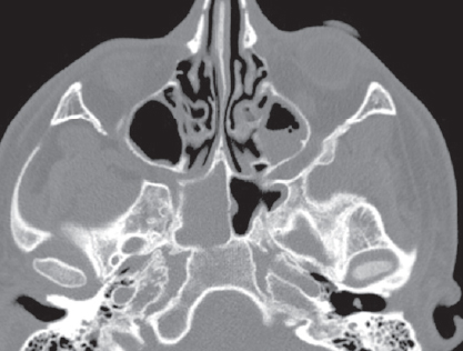 Fig. 4. Computed tomography of the paranasal sinuses and brain from 08.11.21: axial projection in skull mode. Total shading of the right half of the sphenoid sinus on the right, fluid level in the left maxillary sinus