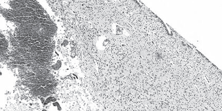 Рис. 3. Нарушение целостности эпендимы, с кровоизлиянием и выходом в полость желудочков. Окраска гематоксилином и эозином. Ув. ×10 / Fig. 3. An ependymal lesion with an intraventricular hemorrhage (H&E stain). Magnification ×10