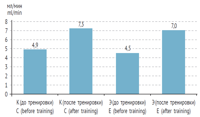 I. Изучение влияния курса криотерапии на уровень микроциркуляции кожи предплечья не выявило статистически значимых изменений у спортсменов-лыжников экспериментальной группы: 5,5 ± 0,3 относительно 5,1 ± 0,4 мл/мин (при р> 0,05) (рис. 1).