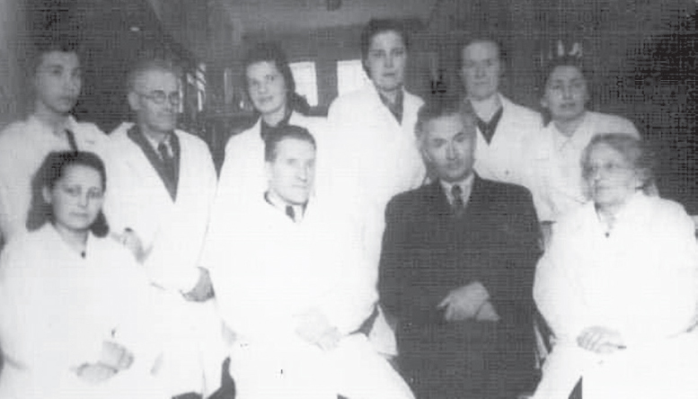 Fig. 2. The staff of the department, who worked in 1951. First row (from left to right): lab. Z.M. Korotkova, ass. V.A. Yuryev, prof. L.T. Soloviev, ass. S.S. Salazkina. Second row: ass. N.I. Lopatina, ass. A.V. Samokhvalov, senior lab. N.V. Archimovich (Skvortsova), preparator A.S. Kasakova, preparator E.I. Mikhailova (Goreva), senior lab. B.M. Krymskaya