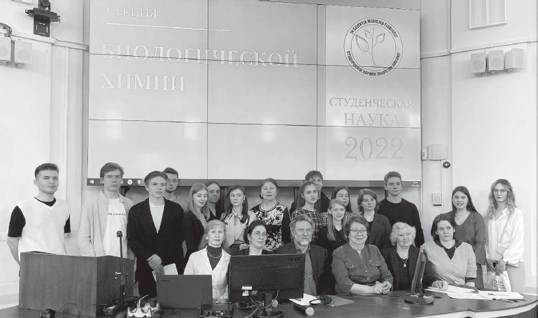 Преподаватели кафедры активно делятся опытом исследовательской деятельности со студентами, аспирантами. На заседаниях СНО обсуждаются вопросы, связанные с актуальными проблемами биохимических исследований на определенном этапе развития патологического процесса, возможности диагностики с использованием маркеров заболеваний. Руководителями СНО были проф. Л.Т. Соловьев (1938–1945), проф. В.А. Юрьев (1945–1960), доцент Н.А. Лебедева (1961–1964), доцент В.В. Кадыков (1964–1973), доцент А.Л. Соловьев (1973–1991), старший преподаватель О.Н. Машек (1992–2001), доцент Н.П. Раменская (с 2001 г. по настоящее время). Результаты своих работ студенты представляют на ежегодной научно-практической студенческой конференции. На рис. 11 весь коллектив кафедры вместе со студентами СНО на конференции «Студенческая наука 2022».
