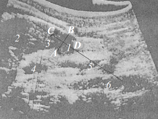 Fig. 1. Features of visualization of the antrum part of the stomach by the ultrasonic method: 1 – antrum of the stomach; 2 – liver; 3 – head of the pancreas; 4 – portal vein; 5 – vein mesenterica superior; 6 – aоrta; АВ – anterior-posterior size of the stomach; СD – longitudinal size