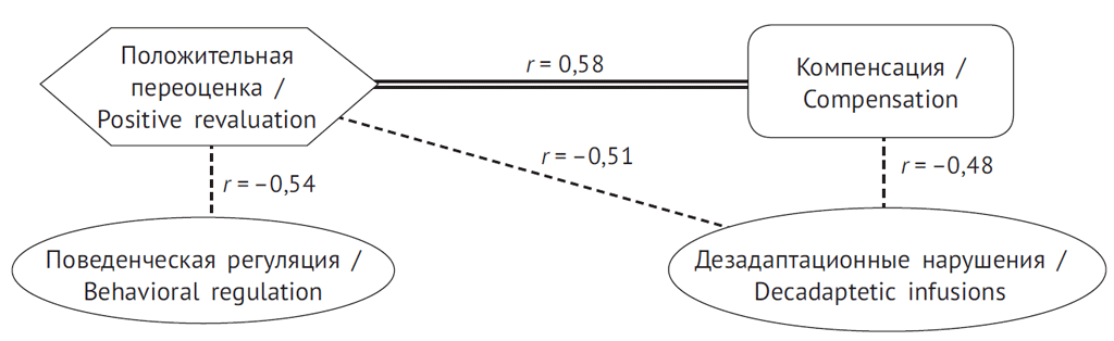 Корреляционный анализ защитно-совладающего поведения у мужчин с АтД выявил следующие связи (рис. 3). Так, ядром этой корреляционной плеяды является копинг-стратегия «положительная переоценка», имеющая сильную положительную связь с механизмом психологической защиты «компенсация» (r = 0,58; p < 0,01), отрицательные связи с проявлениями астенических реакций (r = –0,54; p < 0,01) и поведенческой регуляцией (r = –0,61; p < 0,05), которая также имеет отрицательную связь с «компенсацией» (r = –0,48; p < 0,05).