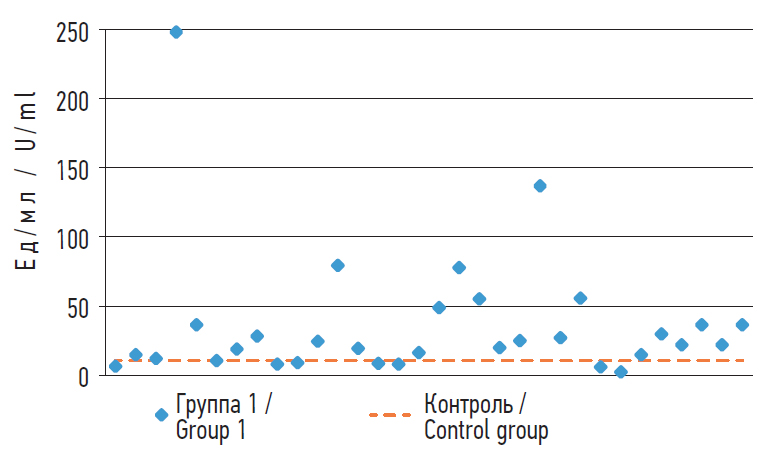 Рис. 1. Уровни аутоантител к нативной ДНК у детей в начальный период MIS-C