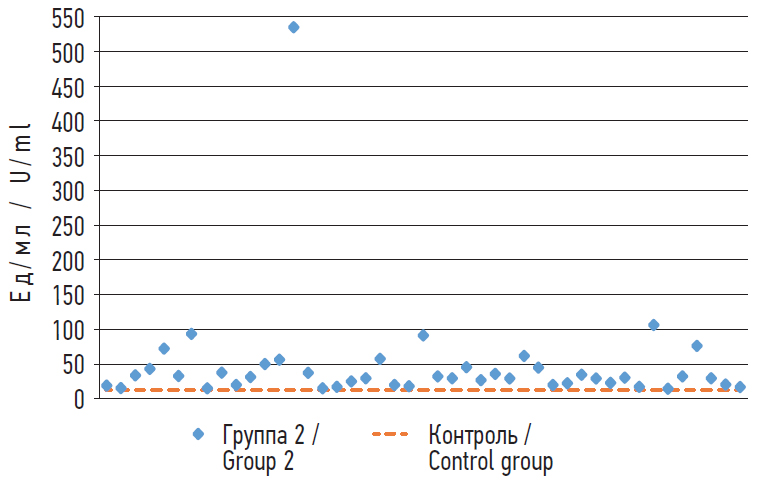 Рис. 2. Уровни аутоантител к нативной ДНК у детей в постреабилитационный период MIS-C