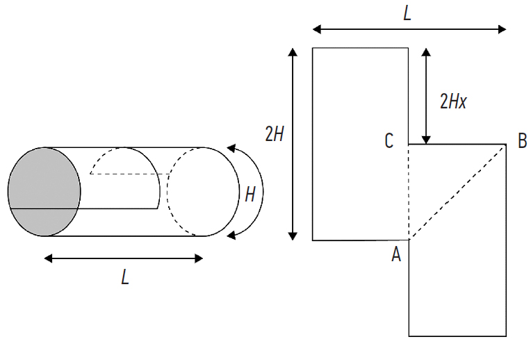 The distance between points A and B on the unrolled and dissected cylindrical surface corresponds to the hypotenuse of the right triangle ABC. The leg AC has a length of 2H – 2H × x, and the leg BC has a length of 1/2 × L. Thus, the width of the intestinal segment after enteroplasty (H'), which is half the distance between points A and B, can be expressed in terms of L, H, and x using the formula: