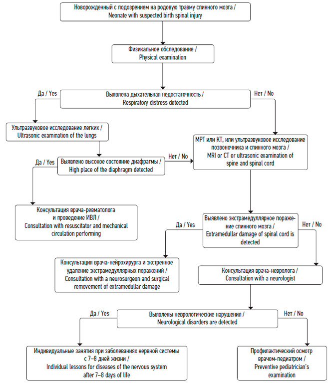 Birth spinal cord injury is damage to the spinal cord of a neonates due to mechanical causes during childbirth. The leading role in the development of spinal cord injury in newborns is played by excessive longitudinal or lateral traction of the spine or excessive twisting. The true incidence of birth spinal cord injury is unclear. There is currently no single classification of birth spinal cord injury and the distinction is made based on morphology, localization, nature and type of disorders. Birth spinal cord injury has 3 main groups of manifestations: stillbirth or rapid death of the newborn; respiratory failure; muscle weakness and hypotension, alternating with spasticity. Along with a visual examination of the newborn, it is recommended to conduct a study of the acid-base balance and blood gases in order to clarify the nature and treatment of respiratory failure; X-ray of the cervical and thoracic spine, ultrasound examination of the spinal cord, computed tomography of the spine and / or magnetic resonance imaging of the spine and spinal cord for the purpose of differential diagnosis; ultrasonic examination of the lungs to detect high placement of the diaphragm in case of damage to the C3–C5 segments of the spinal cord, consultations with a neurologist, anesthesiologist-resuscitator and a neurosurgeon. Mechanic respiratory ventilation is recommended for a newborn with birth spinal cord injury and with signs of damage to the C3–C5 segments and respiratory failure; in the presence of extramedullary damage, fracture or dislocation of the vertebrae — emergency neurosurgical treatment. Rehabilitation includes measures in the form of massage of the upper limb, therapeutic exercise, individual lessons, physiotherapy in order to restore the functions of the muscles and joints of the shoulder girdle; in case of respiratory regulation disorders — home ventilator systems; in case of persistent movement disorders after 1 month of age — transcutaneous electrical neurostimulation of the spinal cord. It is recommended to assess the size of the pregnant woman’s pelvis and the intrauterine presentation of the fetus in order to select the type of delivery to prevent birth spinal cord injury, rational drug therapy and anesthetic care for the pregnant woman in order to prevent dysfunctional labor.