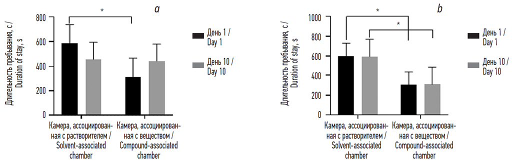 С целью изучения выраженности аверсивного эффекта оценивалась длительность нахождения животного в той или иной камере. В первый день исследования животные предпочитали находится в камере, которая затем в ходе обучения была случайным образом выбрана как ассоциированная с введением растворителя, причем различия в длительности периода были статистически значимы (рис. 4).