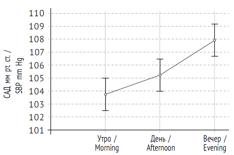Нами также проанализирована динамика САД и ДАД по дням недели (в динамике от первого к седьмому дню), и выявлено, что значения всех измерений как САД, так и ДАД — утренних, дневных и вечерних — повышались от первого к седьмому дню, то есть к концу недели.