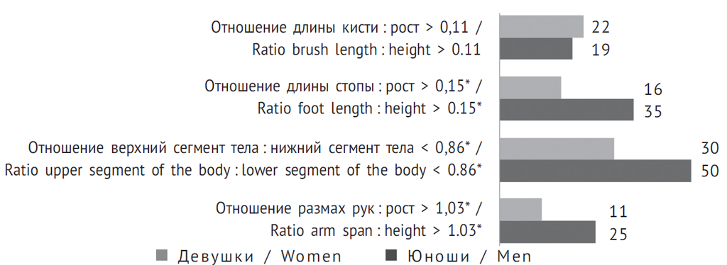 Юношам свойственны бóльшие значения роста, массы тела, длины отдельных частей тела — стопы, кисти, верхнего и нижнего сегментов (табл. 1). Кроме того, для юношей характерны и более значимые диспропорции скелета — три из четырех коэффициентов долихостеномелии встречались у юношей практически в два раза чаще, чем у девушек (рис. 1).