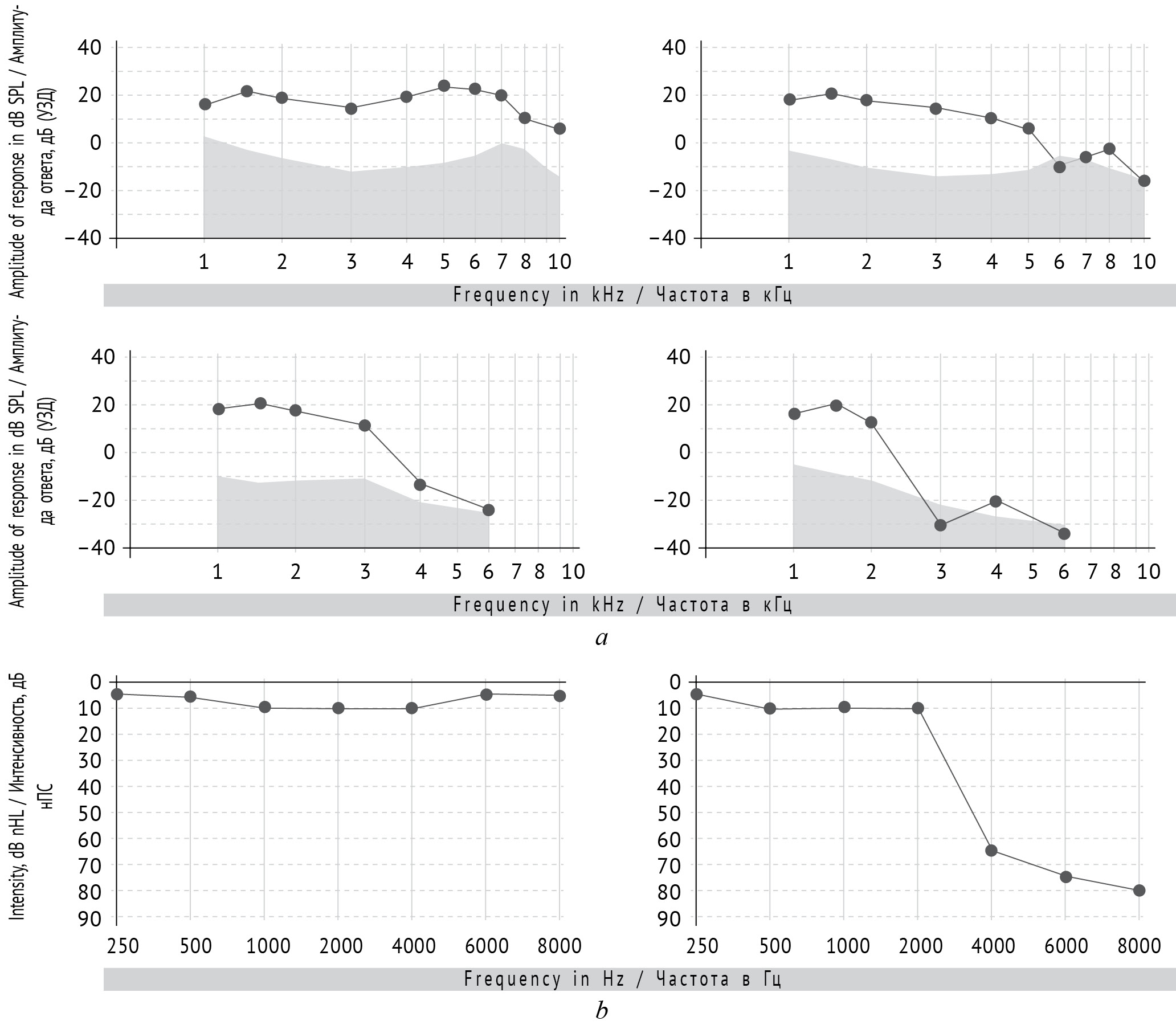 Рис. 3. Низкочастотная тугоухость у ребенка 3 лет: а — тональная пороговая аудиограмма; b — регистрация отоакустической эмиссии на частоте продукта искажения. Серым цветом отмечен фоновый шум; сплошной линией — отоакустическая эмиссия на частоте продукта искажения