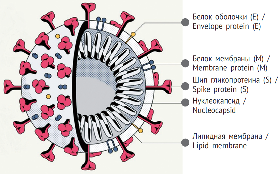 Вирусы имеют сферическую форму диаметром 80–160 нм. Поверхность вириона покрыта булавовидными отростками (шипами), длиной около 20 нм, придающими ему форму короны. Вирусная оболочка состоит из липидного слоя, в котором закреплены структурные белки мембраны (M), оболочки (E) и шипа (S) (рис. 1).