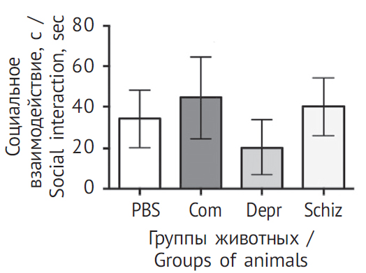 - тест социального взаимодействия (предназначен для изучения общественного поведения животных) [10]. Мышь помещают в двухкамерный бокс с прозрачными перегородками на 10 мин, она может беспрепятственно перемещаться по обеим зонам бокса. Спустя 24 ч в одну зону бокса под колпак из проволоки помещают интактную мышь, в противоположную зону бокса — экспериментальное животное. Оценивали время, проведенное в зоне с интактным животным;