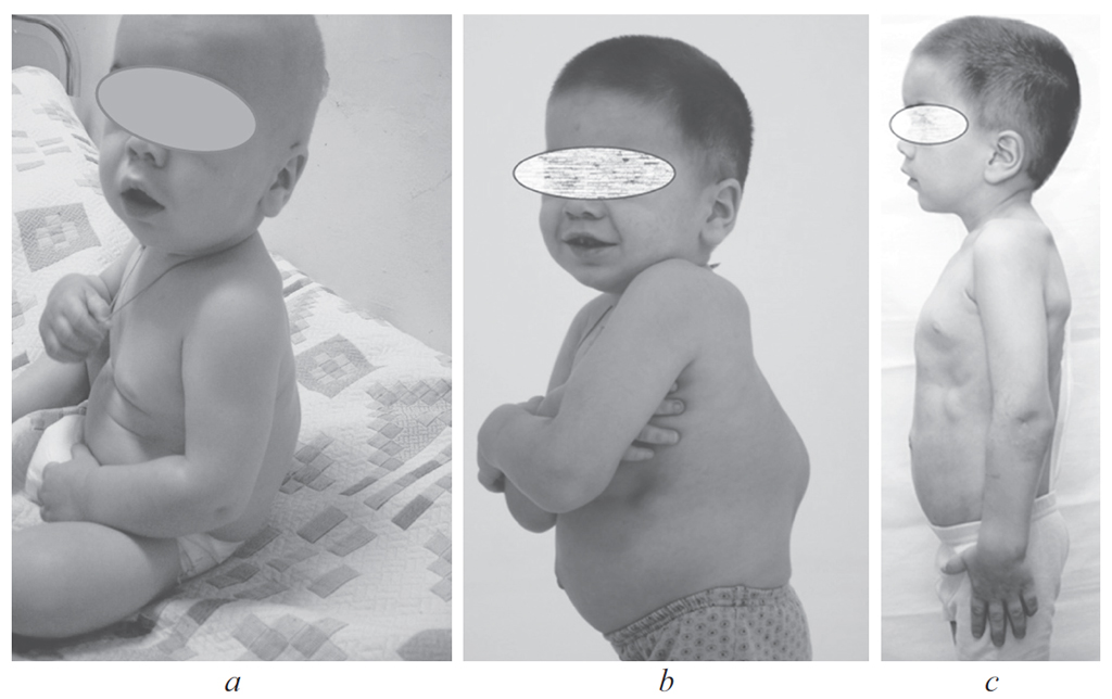 Fig. 2. Boy with mucopolysaccharidosis type I in age: a – of 11 months; b – 3 years 5 months (before surgeon); c – in age of 4 years 5 months (after correction of spine deformity) [6]