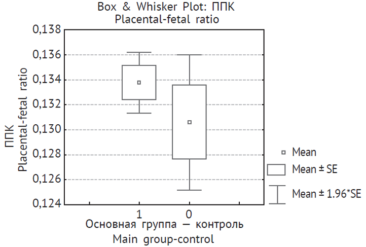 Плацентарно-плодовый коэффициент | 0,17 ± 0,009 | 0,14 ± 0,002 | < 0,05 |