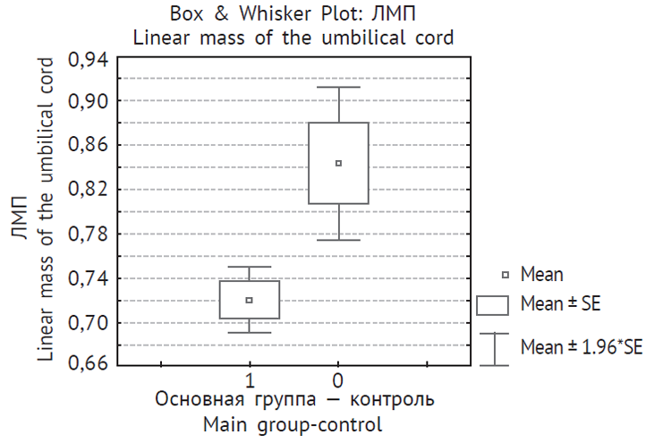 Линейная масса пуповины | 0,84 ± 0,07 | 0,72 ± 0,03 | < 0,001 |